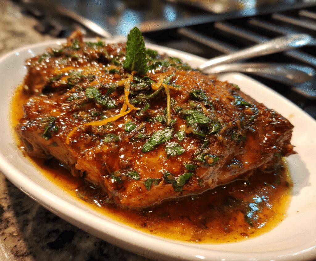 Transfer the cooked pork to a cutting board and tent loosely with foil. Let it rest for 5 minutes to allow juices to redistribute. While it rests, pour the reserved ⅓ of fresh mojo marinade into a small saucepan and bring to a simmer for 1-2 minutes to take the raw edge off the garlic. This becomes your vibrant finishing sauce.