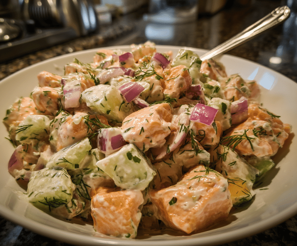 . Elegant Dinner Pairing – For a complete dinner that feels restaurant-worthy, serve slightly smaller portions of the salmon salad alongside a cup of chilled cucumber soup in summer or a small portion of roasted butternut squash soup in colder months. Complement with a glass of crisp Sauvignon Blanc or Pinot Grigio.